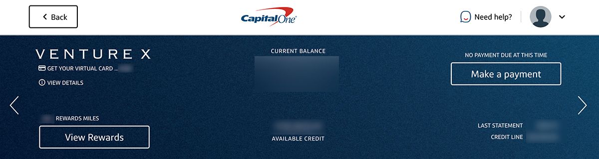 On the dashboard for your Capital One credit card, you should see the prominent “View Rewards” button right under your current balance, card number, and other important details.